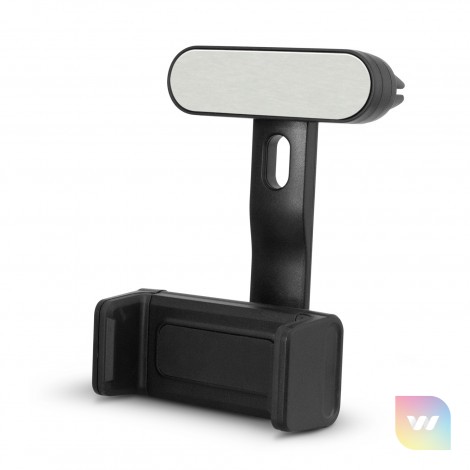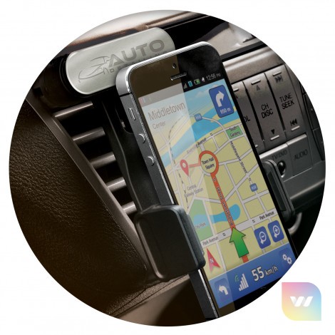 Stylish spring-loaded car phone holder which has a very prominent branding area. It has a soft rubber clip which pushes onto car air vents and securely holds a phone so it can be seen by the driver and used as a GPS.