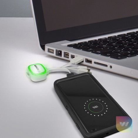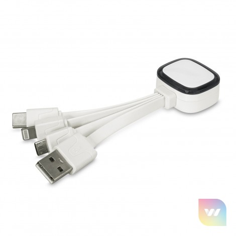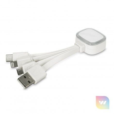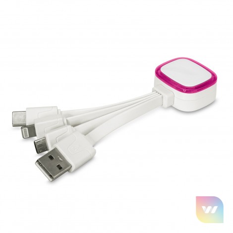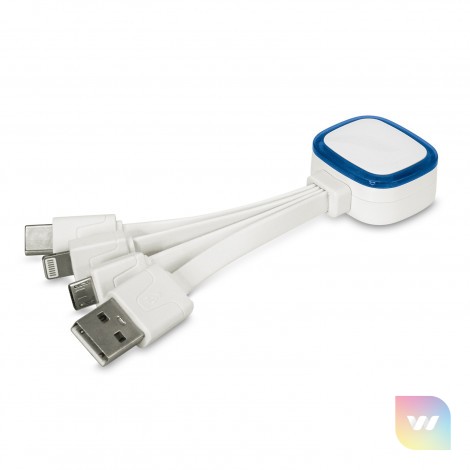 Trendy mobile charging cable which can be used to charge most phones. It has a translucent LED insert that lights up when it is in use and four different connectors. Zodiac has a USB connector cable, a Micro-B connector, a Lightning connector and a USB Type-C connector. This device is for charging only and is not designed for data connections. It can be customised with full colour branding and the choice of seven different coloured translucent inserts.