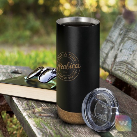 Tall 500ml double wall, vacuum insulated stainless steel cup which will keep drinks hot or cold for hours. It has a soft non-slip base with a trendy cork pattern and a secure push on lid with a sliding closure. Cyprus is BPA-free, laser engraves to a stainless steel finish and is presented in a black gift box. This product is not dishwasher safe and handwashing is recommended.