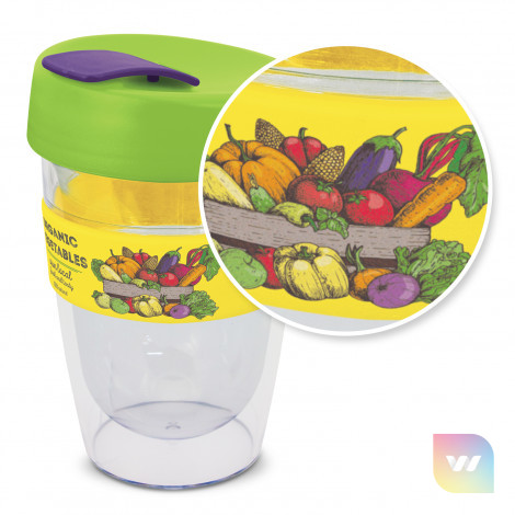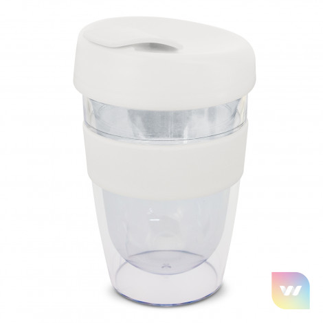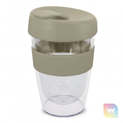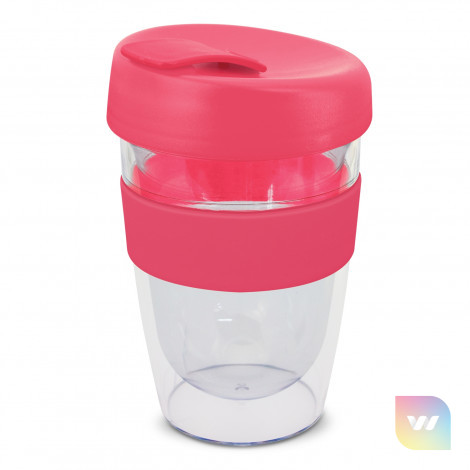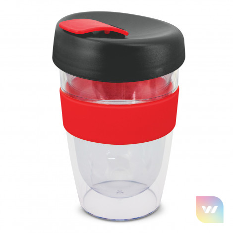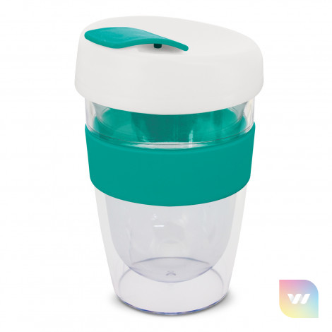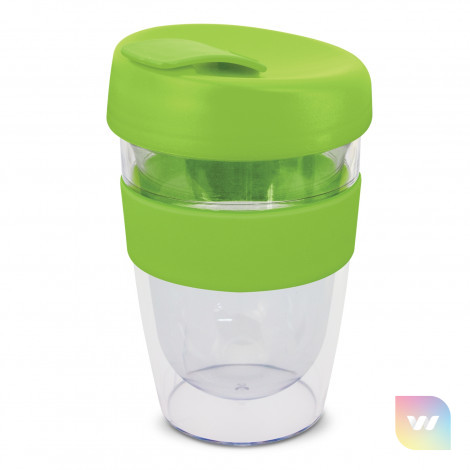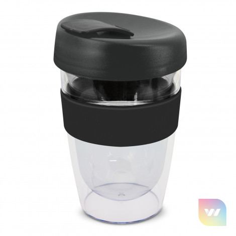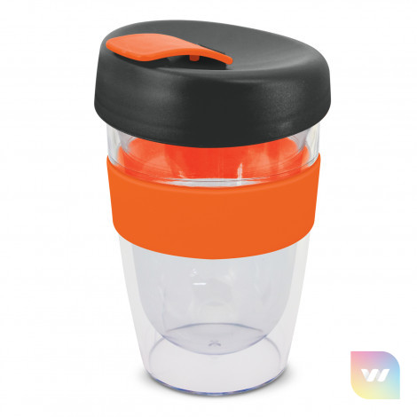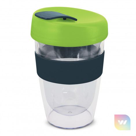 330ml double wall reusable coffee cup which will keep drinks hot for longer. It has a silicone band and a secure screw on lid with a splashproof flip closure. The cup is manufactured from crystal-clear AS plastic and the lid is polypropylene. Both materials are BPA-free. The lid, flip closure and band can be mixed and matched in any colour combination from the standard colours at no extra cost. Up to five different colour combinations are included in the price and more are available for an additional charge. An optional natural gift box is available on request. This product is not dishwasher safe and handwashing is recommended. Express Cup Leviosa is protected under New Zealand Design Registration No. 419451 and Australian Design Registration No. 361937.