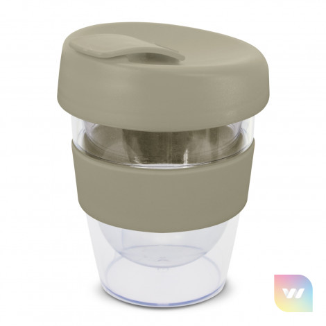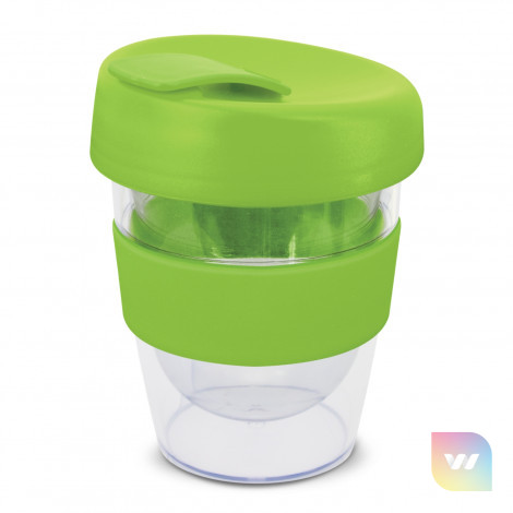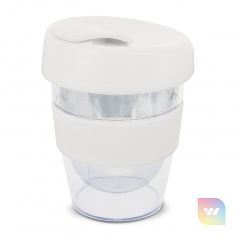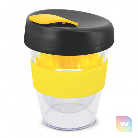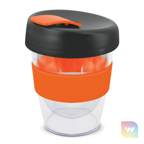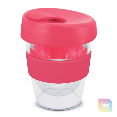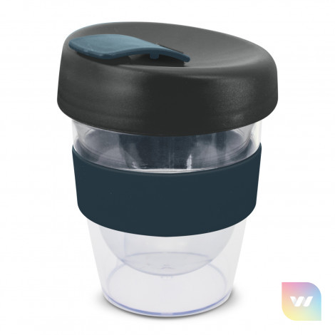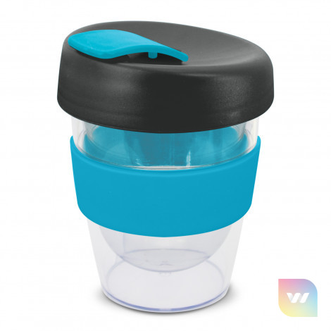 Reusable 230ml double wall coffee cup which will keep drinks hot for longer. It has a silicone band and a secure screw on lid with a splashproof flip closure. The cup is manufactured from crystal-clear AS plastic and the lid is polypropylene. Both materials are BPA-free. The lid, flip closure and band can be mixed and matched in any colour combination from the standard colours at no extra cost. Up to five different colour combinations are included in the price and more are available for an additional charge. An optional natural gift box is available on request. This product is not dishwasher safe and handwashing is recommended. Express Cup Leviosa is protected under New Zealand Design Registration No. 419451 and Australian Design Registration No. 361937.