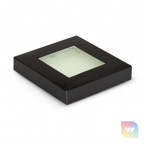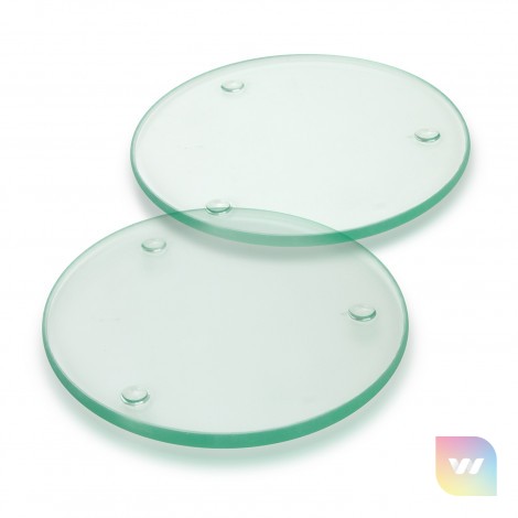 Set of two round glass coasters in an elegant black gift box with a window to show off the brand. The coasters have three non-marking polyurethane pads on the base. Handwashing is recommended.