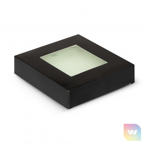 Set of four round glass coasters in an elegant black gift box with a window to show off the brand. The coasters have non-marking polyurethane pads on the base. Handwashing is recommended.