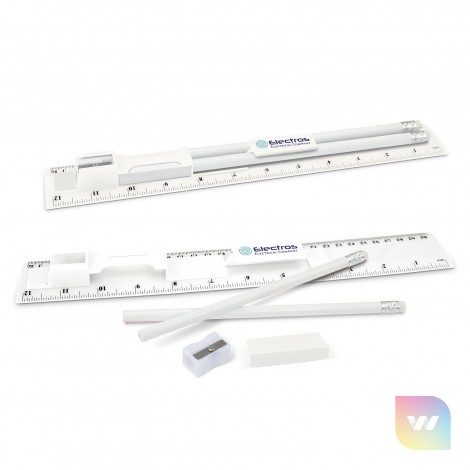 Unique stationery set which consists of a 30cm ruler, two unsharpened pencils, a pencil sharpener and an eraser in one compact unit. The ruler has both metric and imperial graduations.