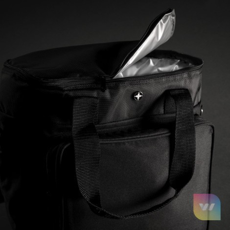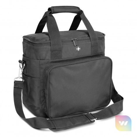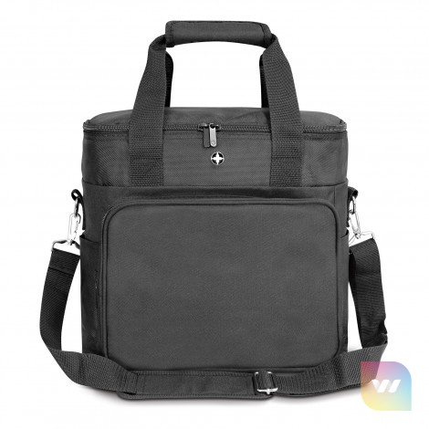 Deluxe 16L Swiss Peak Cooler Bag with thick PE foam insulation encased in a water-resistant PEVA inner liner. The outer construction features a stylish combination of 1680D and 600D polyester. It has strong woven carry handles with a Velcro cuff as well as an adjustable and removable woven shoulder strap with a shoulder pad. Other features include a large zippered top closure, a zippered pocket on the front and slip pockets on both sides.