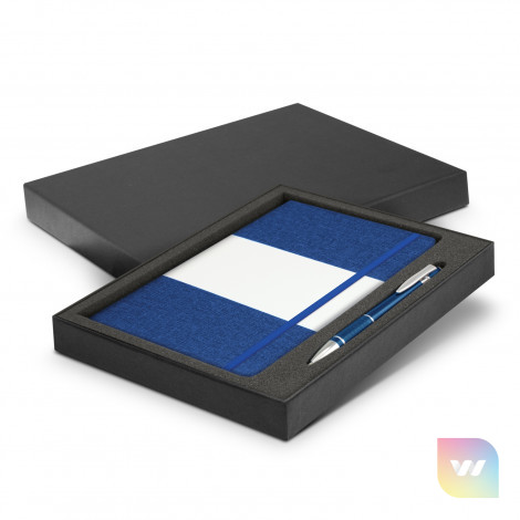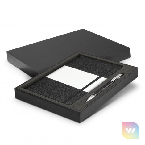 Trendy gift set which is presented in a smart black gift box. It includes a medium size (approximately A5) Alexis Notebook and a retractable aluminium Centra Pen. The notebook has an attention-grabbing hard cover which is finished with a stylish combination of heather style PU matched with leather-look white PU. It has 80 leaves (160 pages) of 80gsm lined cream paper, an elastic closure band and a bookmark ribbon. The pen has a matte anodised barrel and shiny chrome accents. It has a black refill with 800 metres of writing ink and the barrel laser engraves to an oxidised white colour.