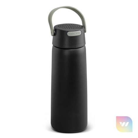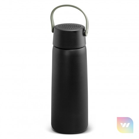 Stylish 700ml double wall, vacuum insulated stainless steel bottle with a powder coated matte finish. It will keep drinks cold for 24 hours or hot for up to 12 hours. The bottle has a secure screw on lid with a soft-touch carry handle and a built-in water-resistant Bluetooth speaker which produces high quality sound. It will play music for approximately two hours and can be recharged from a USB port or a mains adapter. This premium bottle is presented in a black gift box with an instruction leaflet and a Micro-B USB cable. It is BPA-free and laser engraves to a shiny steel finish. This product is not dishwasher safe and handwashing is recommended.