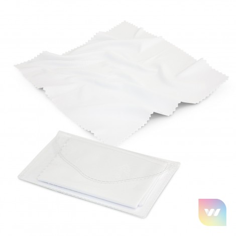 High quality microfibre cleaning cloth for lenses and screens in a handy clear pouch. Branding is on the pouch.