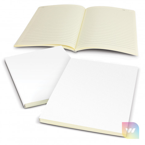 Medium-size (approximately A5) notebook which has 64 leaves (128 pages) of lined cream paper with a date grid at the top of each page. It has a laminated 300gsm cardboard cover which can be branded with stunning edge-to-edge full colour print. A production lead time of 20 working days applies to quantities up to 1,000. A lead time of up to 25 working days applies for quantities over 1,000.