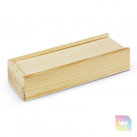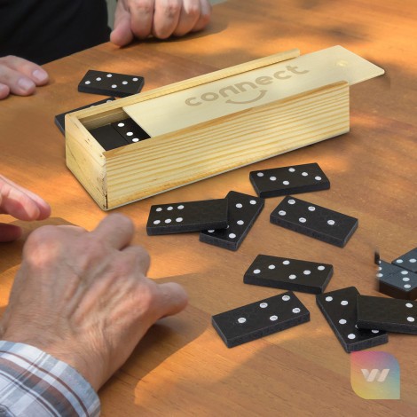Classic game of dominoes where players take turns placing a domino on the table that matches the number of dots on the end of a previously placed domino. The dominoes and instructions are presented in a wooden box with a sliding lid. Branding is on the lid which laser engraves to a natural etch.