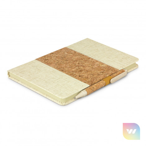 Medium-size (approximately A5), environmentally-focussed notebook with a hard cover that is finished with a stylish combination of natural cork and heathered cotton. The notebook has 80 leaves (160 pages) of 70gsm lined cream paper and an elastic pen loop which holds a matching retractable ball pen. The pen features a natural cork barrel and the accents are manufactured from a 50/50 blend of wheat straw fibre and BPA-free polypropylene. It has a black refill with 700 metres of German manufactured Dokumental ink and a tungsten carbide ball for improved writing quality. The set is presented in a natural unbleached cardboard sleeve.