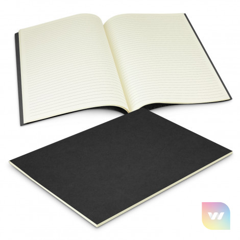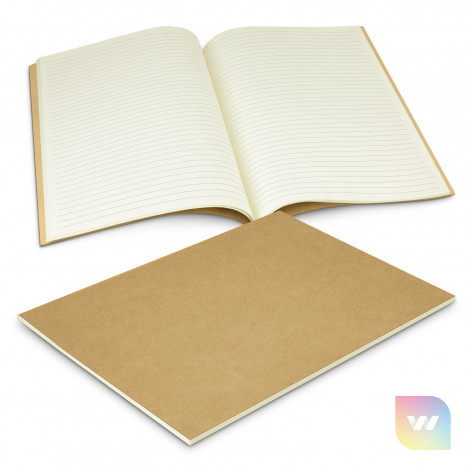 Large (approximately A4) notebook with a 250gsm kraft cardboard cover and matching saddle-stitched binding. It has 32 leaves (64 pages) of 70gsm lined paper.