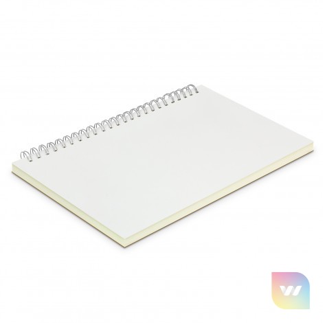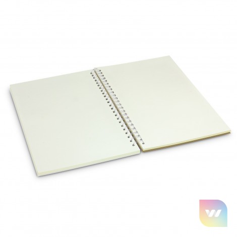 Fully customised A5 size notebook with silver wiro binding and 60 leaves (120 pages) of 70gsm cream paper which is available lined or unlined. Individual pages can be customised in one colour or full colour for an additional cost. The notebook has an 1100gsm unbleached grey cardboard back cover and a 350gsm cardboard front cover which can be branded with stunning edge-to-edge full colour print. A production lead time of 35 working days applies to this product by air freight and larger orders can be sea freighted on request to reduce the freight cost.