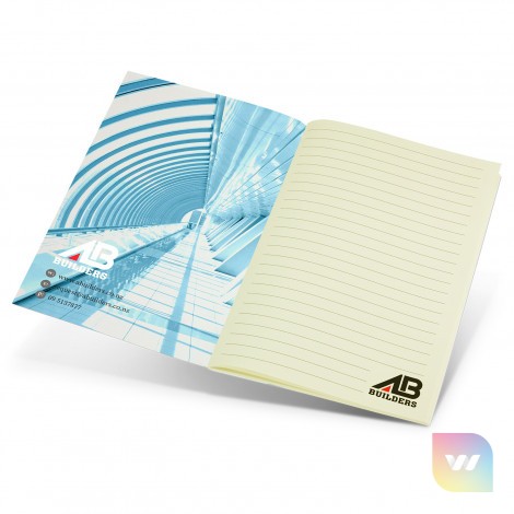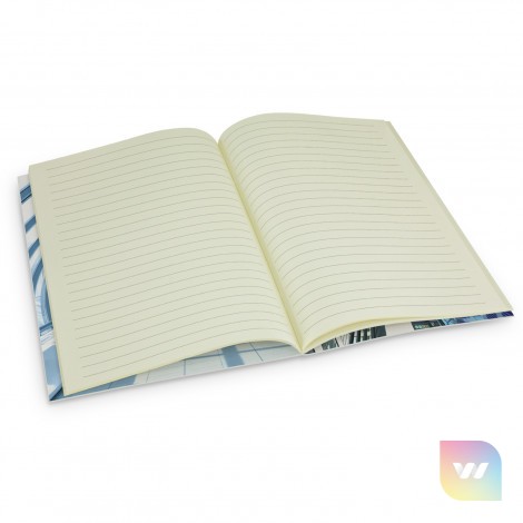 Fully customised A5 size notebook with saddle stitch binding and 32 leaves (64 pages) of 70gsm cream paper which is available lined or unlined. Individual pages can be customised in one colour or full colour for an additional cost. The notebook has a 250gsm cardboard cover which can be branded with stunning edge-to-edge full colour print on the front and back. An optional paper belly band is available and can be branded in full colour. A production lead time of 35 working days applies to this product by air freight and larger orders can be sea freighted on request to reduce the freight cost.