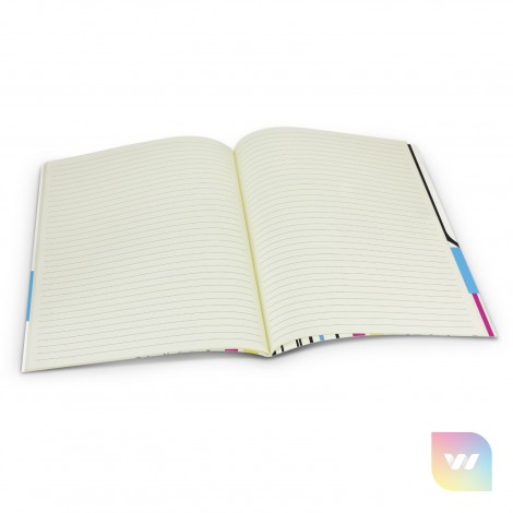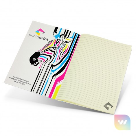 Fully customised A4 size notebook with saddle stitch binding and 32 leaves (64 pages) of 70gsm cream paper which is available lined or unlined. Individual pages can be customised in one colour or full colour for an additional cost. The notebook has a 250gsm cardboard cover which can be branded with stunning edge-to-edge full colour print on the front and back. An optional paper belly band is available and can be branded in full colour. A production lead time of 35 working days applies to this product by air freight and larger orders can be sea freighted on request to reduce the freight cost.