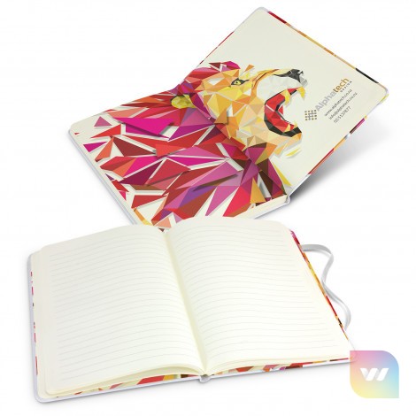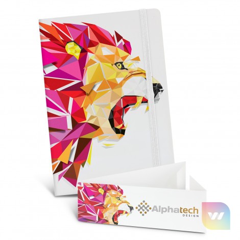 Fully customised, medium-size (approximately A5) notebook with a hard cover and 64 leaves (128 pages) of 70gsm cream paper which is available lined or unlined. Individual pages can be customised in one colour or full colour for an additional cost. The cover can be branded on both sides with stunning edge-to-edge full colour print. Supra has a bookmark ribbon and an elastic closure band which can be mixed and matched from the standard colours. An optional paper belly band is available on request and can be branded in full colour. A production lead time of 45 working days applies to this product by air freight and larger orders can be sea freighted on request to reduce the freight cost.