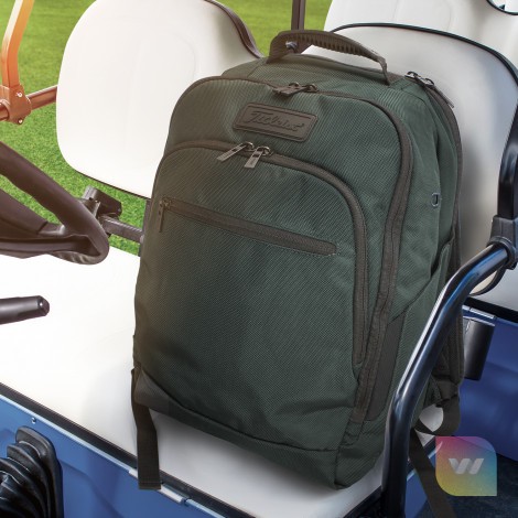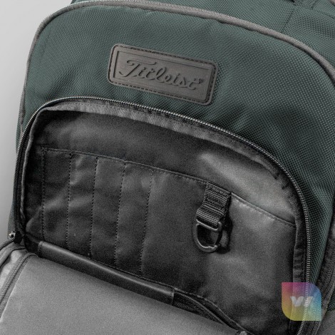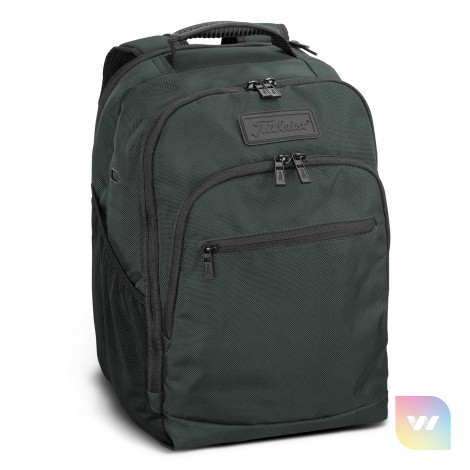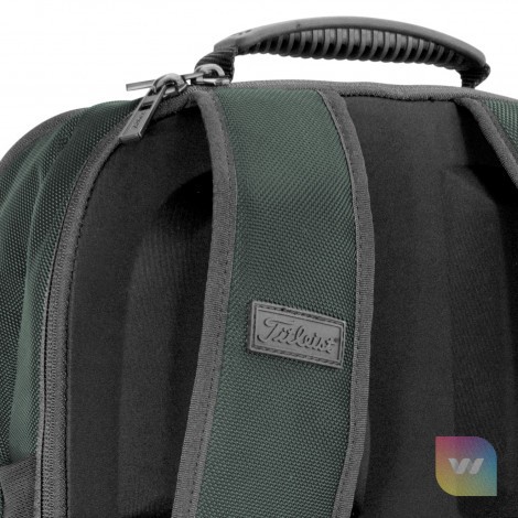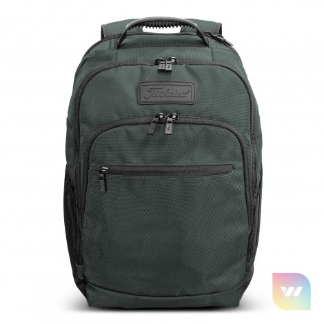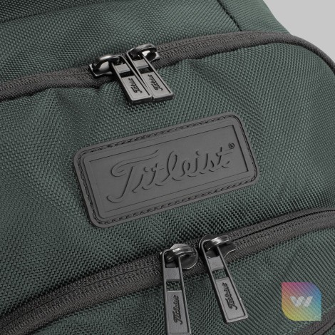 The Titleist Players Backpack combines superior quality with functional style and lives up to the brand’s reputation as golf’s symbol of excellence. The adjustable and breathable shoulder straps, ample foam lumbar support and spacious main compartments make it ideal for golfers or day trippers. Manufactured from durable 600D polyester it features three zippered compartments with generous internal organisation to securely stow a 15-inch laptop, books, wallets, pens and more. The smaller front compartment has a discrete internal zippered valuables pocket, a Velcro pocket, and a carabiner clip. Other features include a front zippered pocket which can be co-branded, two large side drink bottle sleeves, a sturdy rubber carry handle and a luggage strap so it can slide onto a rolling suitcase handle. The Titleist logo is subtly branded at the top of the main compartment and on the right shoulder strap. Please note this product cannot be supplied without the Titleist logo.