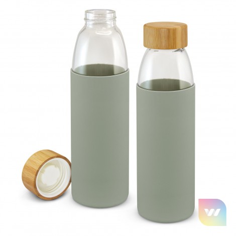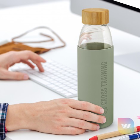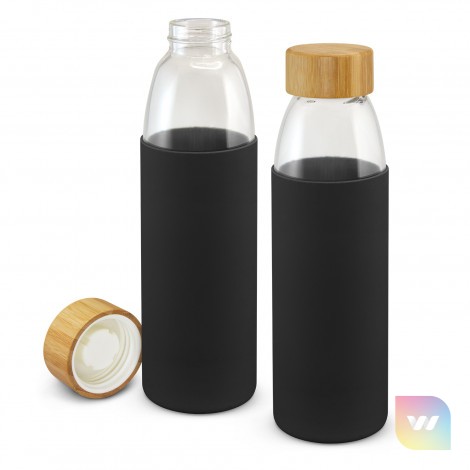 Elegant 500ml borosilicate glass drink bottle which features a protective soft-touch silicone sleeve and a secure screw on natural bamboo lid. Borosilicate is a lightweight glass that is exceptionally strong and shatter-resistant. Glass is a natural choice for a clean, pure taste and is a safe and reusable alternative to single-use plastic. Solstice is BPA-free and is presented in a white box. Bamboo is a natural material which produces unavoidable variances in the grain pattern, colour and branding. This product is not dishwasher safe and handwashing is recommended.