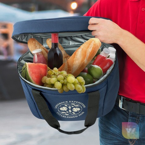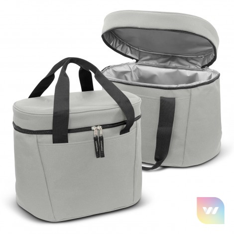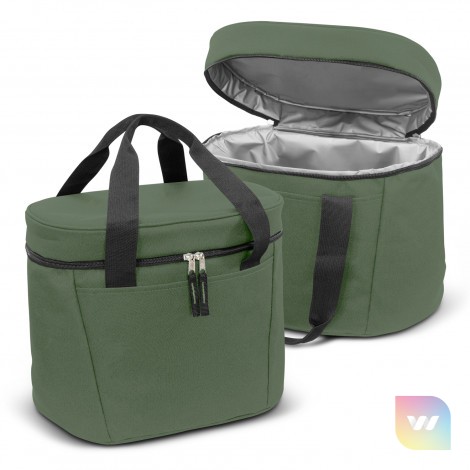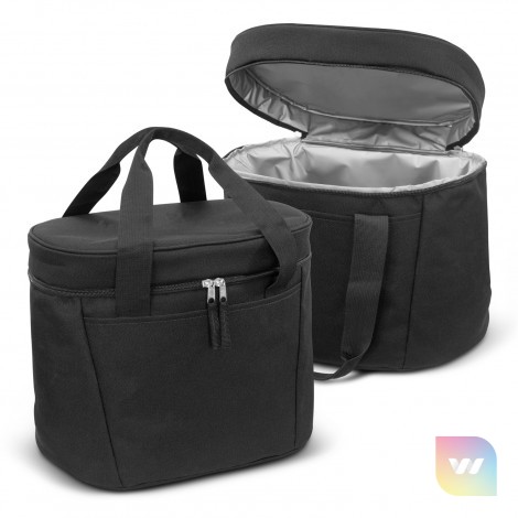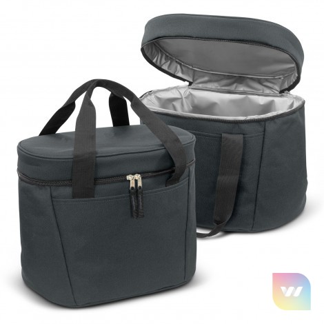Large 20L cooler bag which is manufactured from robust 600D polyester with PE foam insulation encased in a water-resistant PEVA inner liner. It has a zippered top closure with large zipper pulls, woven carry handles and a front slip pocket.