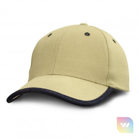 Fully customisable six-panel cap which is made from cotton twill and features an embroidered design on the peak. The colour of the cap fabric and the embroidery feature can be customised using colours from the standard colour palette. Other features include embroidered eyelets, a pre-curved peak, a sweatband and an adjustable snap closure which allows one size to fit most people. A production lead time of 35 working days applies to this product by air freight and larger orders can be sea freighted on request to reduce the freight cost.