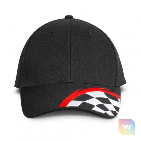 Perfect for racing and car enthusiasts, this fully customisable six-panel cap is made from cotton twill and features an embroidered chequered racing design on the peak. The colour of the cap fabric and the embroidery feature can be customised using colours from the standard colour palette. Other features include embroidered eyelets, a pre-curved peak, a sweatband and an adjustable snap closure which allows one size to fit most people. A production lead time of 35 working days applies to this product by air freight and larger orders can be sea freighted on request to reduce the freight cost.