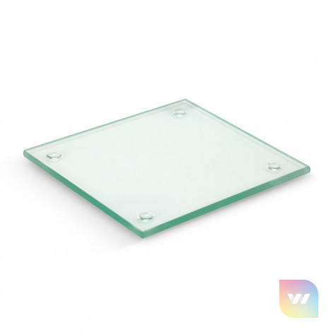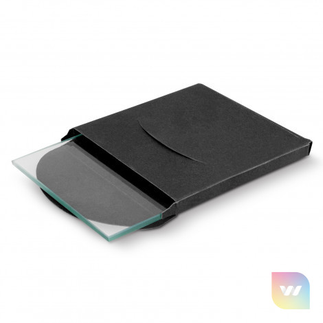 Square glass coaster which is presented in a smart cardboard sleeve. The coaster has four non-marking polyurethane pads on the base. The branding is on the underside of the coaster and handwashing is recommended.