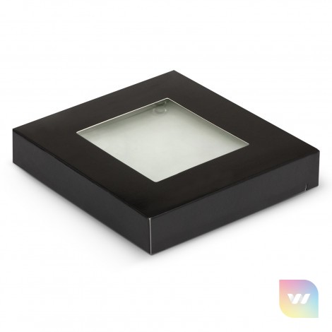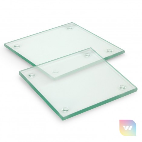 Set of two square glass coasters in a stylish black gift box with a window to show off the brand. The coasters have four non-marking polyurethane pads on the base. The branding is on the underside of the coaster and handwashing is recommended.