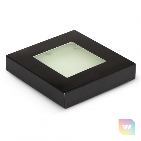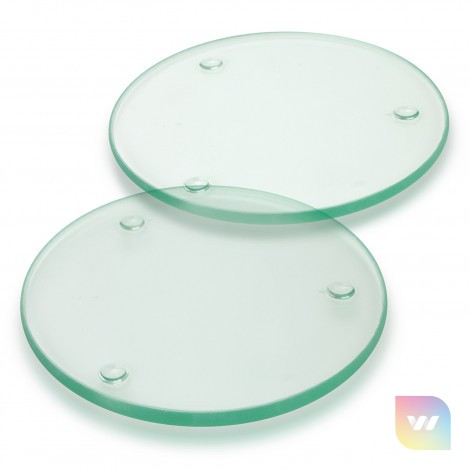 Set of two round glass coasters in a stylish black gift box with a window to show off the brand. The coasters have three non-marking polyurethane pads on the base. The branding is on the underside of the coaster and handwashing is recommended.