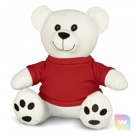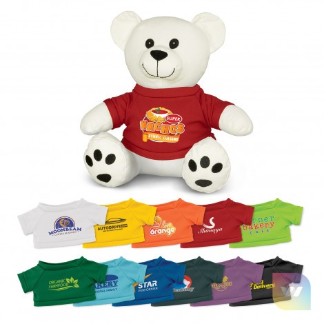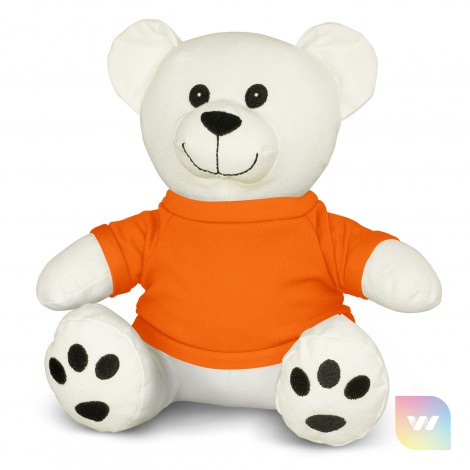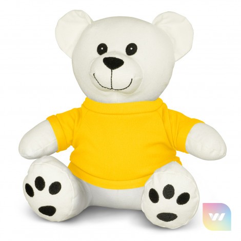 Soft cotton teddy bear with embroidered eyes, RPET filing and an optional polyester t-shirt which is available in eleven colours. This cotton bear is perfect for any occasion and provides a perfect canvas for collecting signatures and personal messages at events and milestones. Plush animals provide a cute and cuddly branding option and are great for brand recognition and spreading goodwill. They have also been manufactured to meet with AS/NZS Safety Toy Standards.