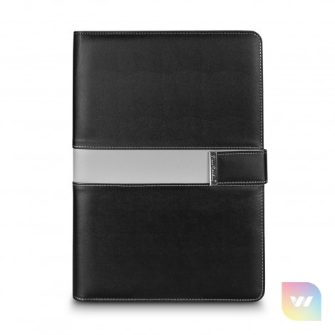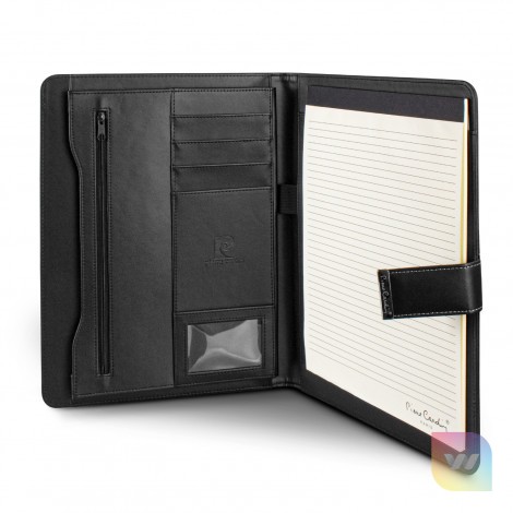 Classically designed portfolio from Pierre Cardin which is hand crafted from the highest quality leather-look PU. It has a smart magnetic closure and a Pierre Cardin note pad with 30 leaves of 80gsm lined cream paper. Valence has a large slip pocket which will hold a tablet and a smaller zippered pocket. Other features include a card holder with a window, a phone pocket, four card pockets and an elastic pen loop. The Pierre Cardin logo is tastefully engraved on the magnetic closure and debossed on both the phone holder and the back of the portfolio. Valence is beautifully presented in a premium Pierre Cardin gift box.