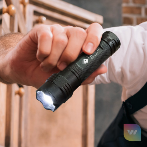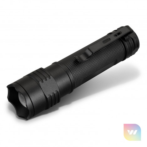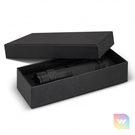Large 3W metal torch with an adjustable beam which is fitted with bright LEDs. It has a belt clip and is equipped with a 1200mAh rechargeable battery. The torch comes with a USB cord to enable recharging. The torch laser engraves to an oxidised white colour, and it is presented in a black gift box.
