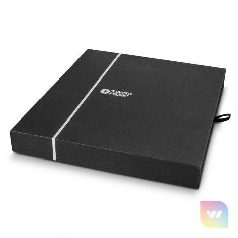The ultimate gift for writing lovers, the Swiss Peak notebook and pen set is essential. The notebook has a PU cover with a flap magnetic closure with a silver metal logo. With 80 sheets (160 pages) of 80gsm cream lined paper this A5 notebook is the best addition to any creative stationery set. The black metal pen has 1200m of blue German Ink. Laser engraving on this product comes as a stainless steel finish. This luxury notebook and pen set is presented in a deluxe Swiss Peak gift box.