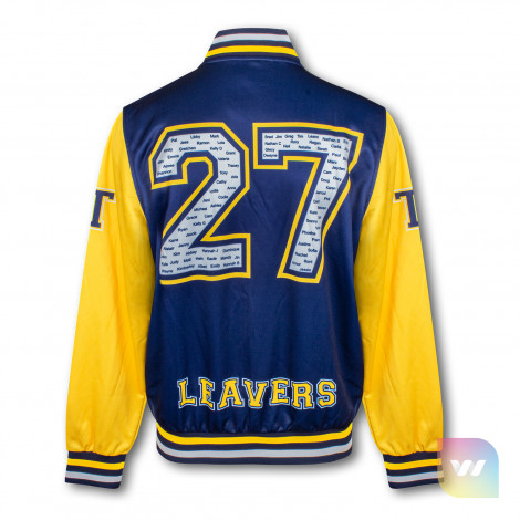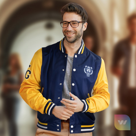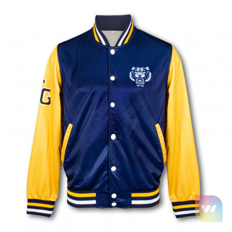 Brushed fleece lined unisex custom varsity jacket, which is manufactured from 280gsm, 100% polyester jersey. The jacket is a regular fit with a snap button front closure. The knitted hem and cuffs provide an adjusted fit to those areas. Other features include two side welt pockets and a knitted curve collar. The hem, cuffs and collar are available in a choice of 19 colours. It is available in seven sizes which can be branded edge to edge in spot colours or full-colour print. Personalisation e.g. names and numbers are available free of charge. A production lead time of 40 working days applies to this product by air freight and larger orders can be sea freighted on request to reduce the freight cost. Custom labels are available upon request free of charge.