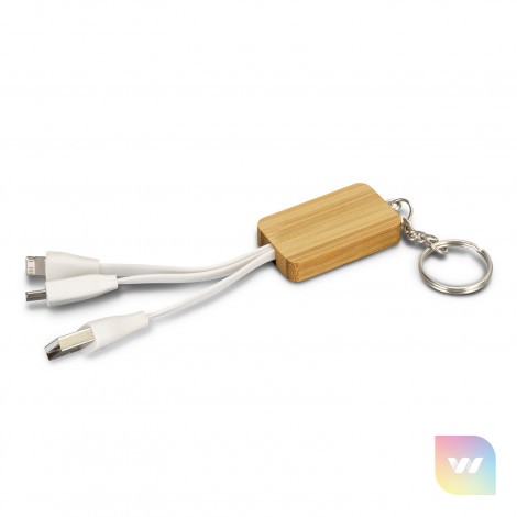 A handy mobile charging cable key ring for phones, tablets, cameras, GPS etc. It offers three different connectors in one compact bamboo unit, a USB, Type-C, and a Lightening that can be flipped over to be a Micro-B. This device is for charging only and is not designed for data connections. Bamboo is a natural material and because the plant is fast growing, it places less demands on natural resources and produces a material that is durable and versatile. Bamboo can also produce unavoidable variances in the grain pattern, colour and branding. It laser engraves to a natural etch.