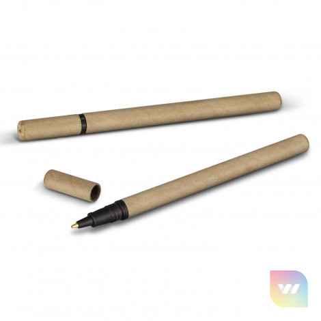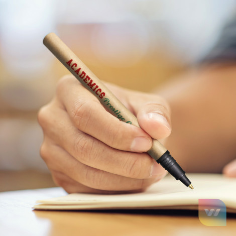 Environmentally-conscious ballpoint pen with a kraft paper barrel and removable lid. It has a blue refill with 500 metres of ink and it can be presented in an optional pen sleeve.