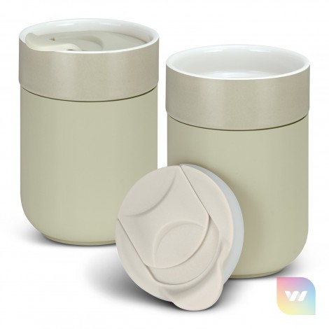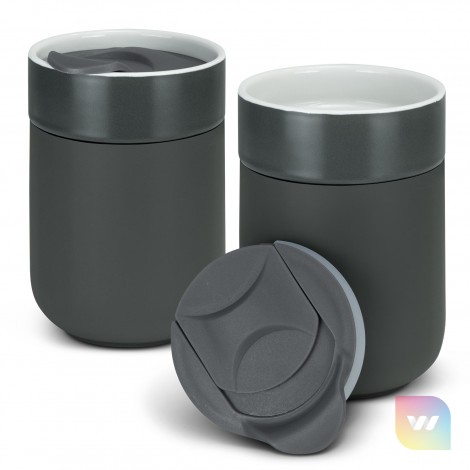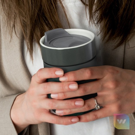 Fashion-inspired 300ml ceramic coffee cup that has a heat-resistant silicone casing. The slide-closure lid insert can be easily taken in and out. This product is not dishwasher safe and handwashing is recommended.