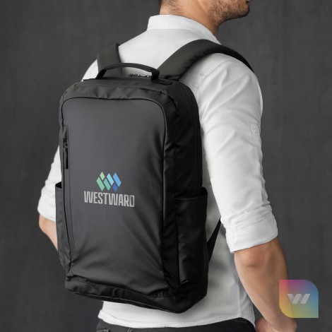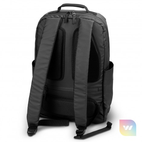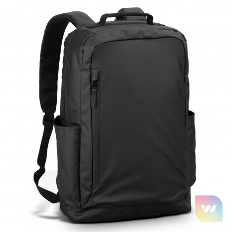Modern backpack which is manufactured from polycanvas with a water-resistant PU coating. It has an inner compartment to hold a laptop or a tablet, a padded back fitted with a zippered pocket for comfortable carrying and a padded base. Other features include padded woven shoulder straps which are adjustable, a woven carry handle, a large, zippered pocket on the front, and a water bottle holder.