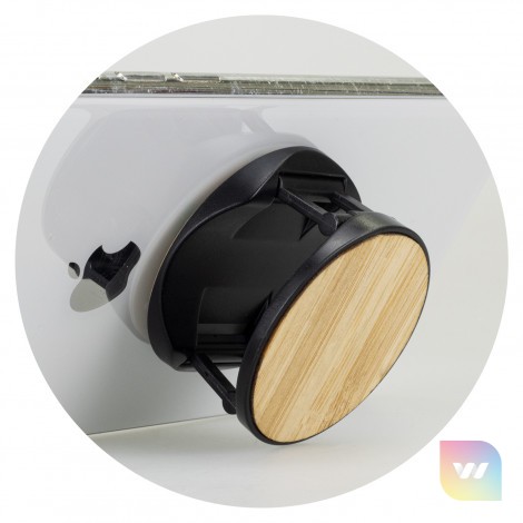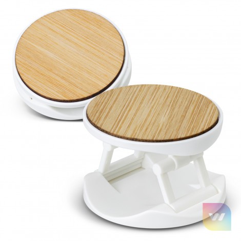 Bamboo phone holder which sticks onto the back of any mobile phone and provides grip for using the device. It is manufactured from plastic and bamboo. The phone holder also works as a stand, and it will hold a mobile phone in a horizontal position on a surface for easy viewing. Bamboo is a natural material and because the plant is fast growing, it places less demands on natural resources and produces a material that is durable and versatile. Bamboo can also produce unavoidable variances in the grain pattern, colour and branding.