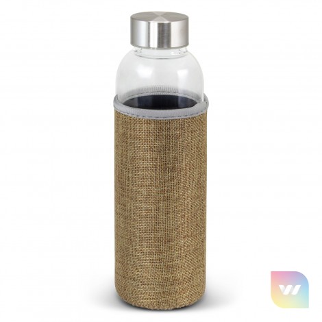 Deluxe 600ml borosilicate glass drink bottle which features an insulating soft poly jute sleeve that helps to keep drinks cool. The sleeve is fashion-inspired textured polyester outer. It has a secure screw-on stainless steel lid which can be laser engraved with a logo. Borosilicate is a lightweight glass that is exceptionally strong and shatter-resistant. Glass is a natural choice for a clean, pure taste and is a safe and reusable plastic alternative. This product is not intended to be used with carbonated or hot liquids. It is not dishwasher safe and handwashing is recommended.