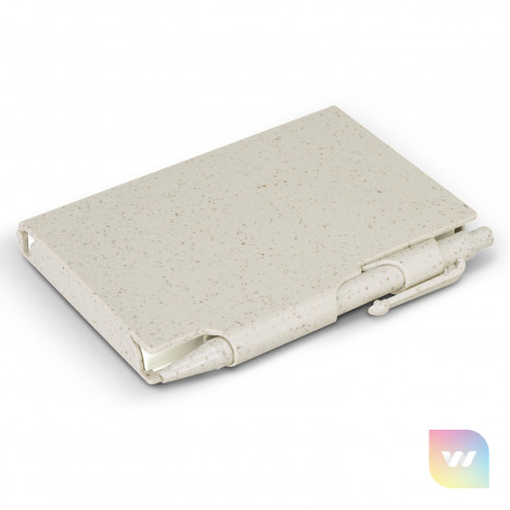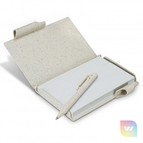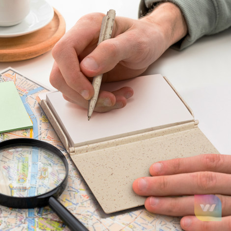 Pocket-size (approximately A6) notebook in a compact case made from a blend of natural wheat straw fibre and ABS plastic. The notebook includes a pen that locks the case closed when in the pen holder, and features a pad with 80 leaves of unlined paper.