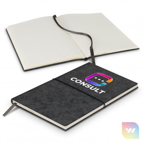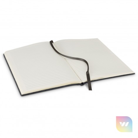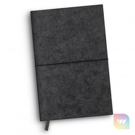 Exceptional medium-size (approximately A5) notebook with 70 leaves (140 pages) of 80gsm lined cream paper and a bookmark ribbon. It has a soft cover manufactured from recycled post-consumer polyester with an elastic closure.