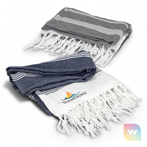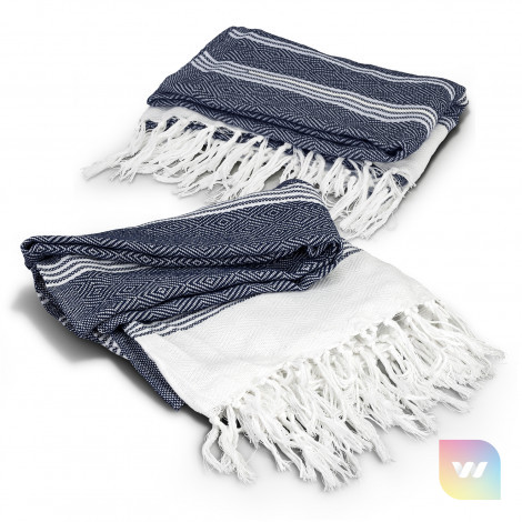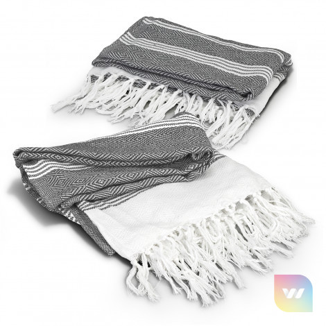 Trendy blanket manufactured from 500gsm 50% Recycled Cotton, 50% polyester. It features a textured square pattern with a fringed trim.