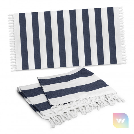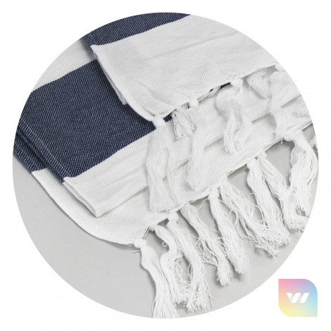 Beach inspired cotton towel manufactured from 200gsm 100% Cotton. It features a rustic style weave with stripes and a fringed trim.