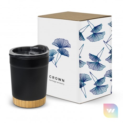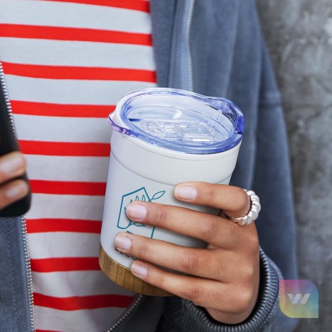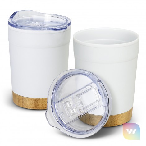 Stylish 350ml double wall, polypropylene and stainless steel coffee cup with natural bamboo base. Valetta features a translucent splashproof, push on, BPA-free slider lid with a secure silicone seal.