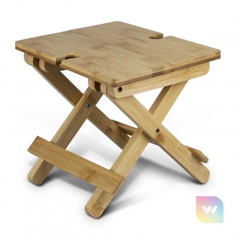 Stylish natural folding wine table manufactured from bamboo. It holds two wine glasses, making it perfect for wine tastings, picnics, or outdoor events. The table is designed with collapsible folding legs. It comes in natural kraft gift box with NATURA branding.