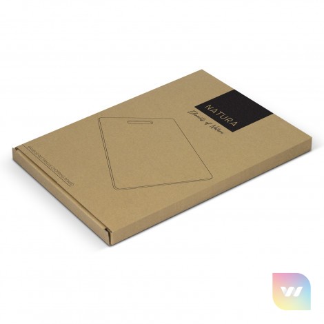 Durable rectangle bamboo chopping board. It is presented in natural kraft gift box with NATURA branding.