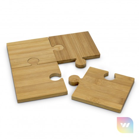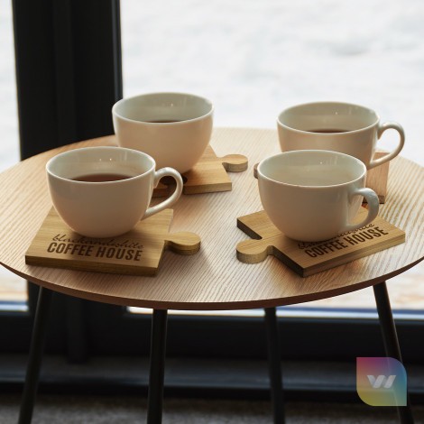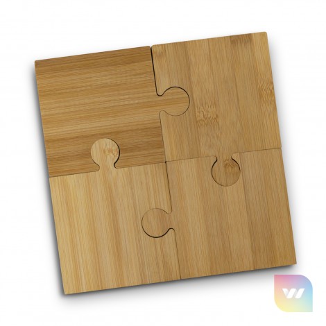 Unique set of 4 individual coasters made of natural bamboo. They interconnect to form a puzzle-like design. The set comes in natural kraft gift box with NATURA branding.