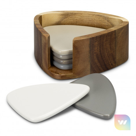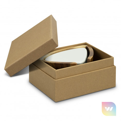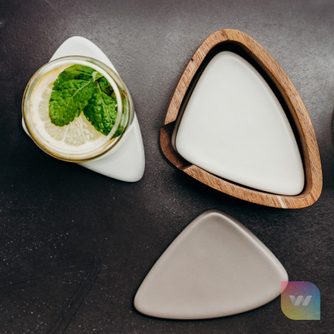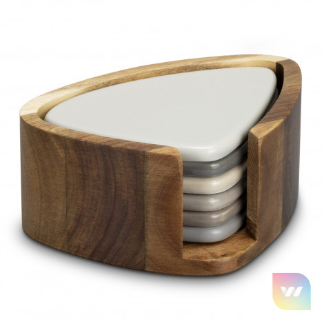 Functional set of six ceramic coasters in the shape of New Zealand river stones, each in a different shade of neutral grey and taupe, with a compact acacia wood holder for storage. Presented in a natural gift box with a branded black sleeve.