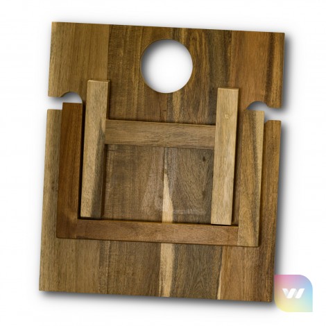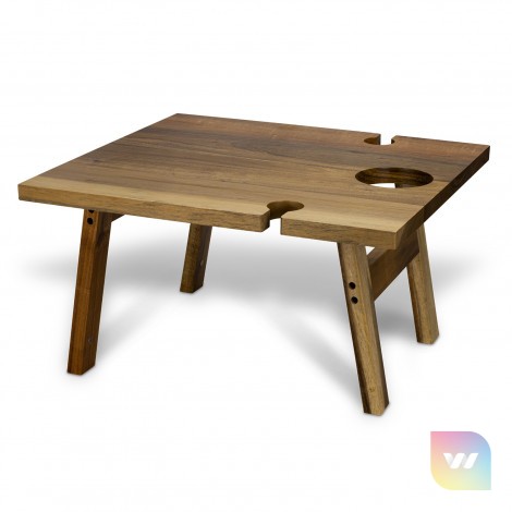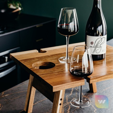 Luxurious acacia wooden wine table with smooth folding legs which are equipped with magnets to ensure the wine table is secure. Fitted with two wine glass holders and a bottle holder, the folding wine table is presented in a natural gift box with a branded black belly band and hangtag.