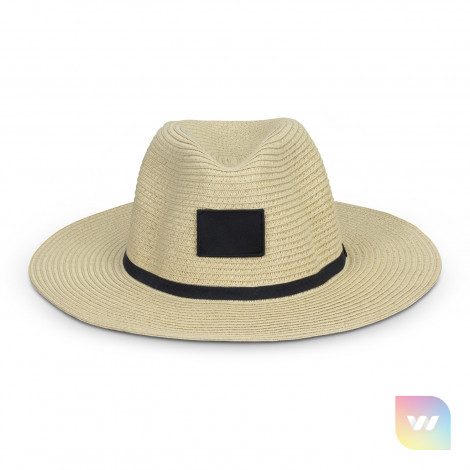 Classic paper weave wide brim hat with a coloured polyester ribbon, featuring a patch for convenient and prominent branding.